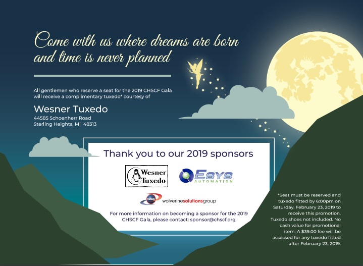 All gentlemen who reserve a seat for the 2019 CHSCF Gala will received a complimentary tuxedo* courtesy of Wesner Tuxedo!
